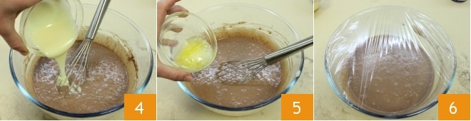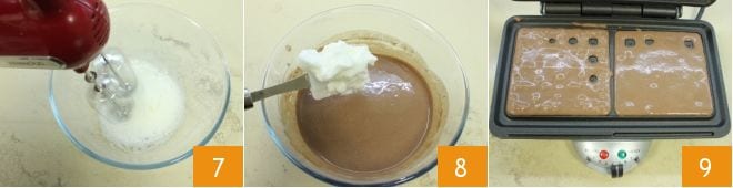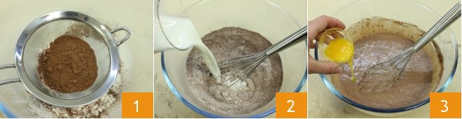 Um die Schokoladen- und Passionsfruchtwaffeln herzustellen, siebt in einer Schüssel das Mehl, das Backpulver und den ungesüßten Kakao 1, gießt die Milch unter Rühren mit dem Schneebesen dazu 2. Trennt das Eigelb vom Eiweiß und gebt das Eigelb in die Mischung 3, wobei ihr darauf achtet, das Eiweiß aufzubewahren.