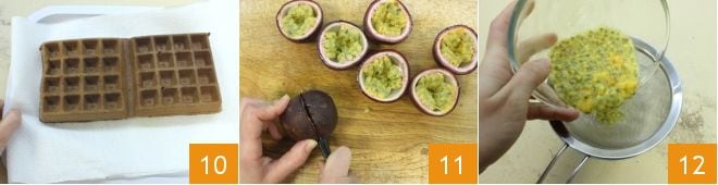Schließt das Waffeleisen und backt den Teig etwa 5 Minuten oder nach der Vorgabe eures Waffeleisens. Nach dem Backen aus der Form nehmen und abkühlen lassen 10. Jetzt widmet euch der Sauce: Schneidet die Passionsfrüchte in zwei Hälften 11, entnehmt das Fruchtfleisch und passiert es durch ein Sieb, um die Samen zu entfernen und sammelt es in einer Schüssel 12,