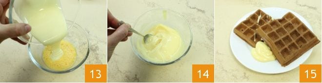 fügt die Kondensmilch hinzu 13 und rührt, um eine dicke und homogene Sauce zu erhalten 14. Serviert eure Schokoladenwaffeln auf einem Teller und begleitet sie mit der Passionsfruchtsauce 15.