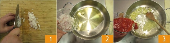 Um den Seeteufel im Sud zuzubereiten, beginnen Sie zuerst mit der Sauce. Schälen und hacken Sie die Schalotte 1. In einem Topf geben Sie die fein geschnittene Schalotte, das Öl und den Knoblauch 2. Dünsten Sie die Schalotte bei niedriger Hitze für etwa 5-6 Minuten. Geben Sie das Tomatenpüree dazu 3.