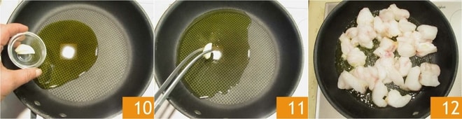 In einer anderen Pfanne geben Sie etwas Öl und den Knoblauch, erhitzen Sie es bei schwacher Hitze, um es zu würzen 10. Entfernen Sie den Knoblauch 11 und legen Sie die Seeteufel-Stücke hinein 12.