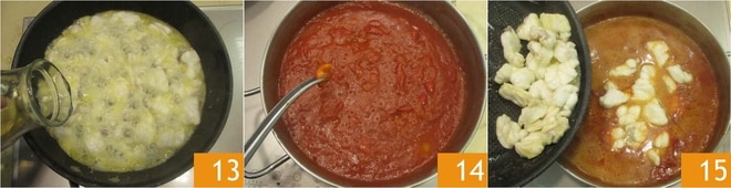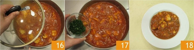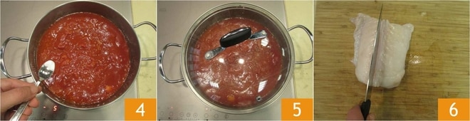 Salzen, fügen Sie eine Prise Natron hinzu, um die Säure der Tomaten zu neutralisieren 4. Reduzieren Sie die Hitze und lassen Sie es mit Deckel für 25-30 Minuten kochen 5. Nach 20 Minuten schneiden Sie den Seeteufel in der Mitte durch 6.