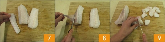 und entfernen Sie den Mittelgräte 7. Entfernen Sie Hautreste 8 und schneiden Sie ihn in gleich große Stücke, etwa ein paar Zentimeter 9.