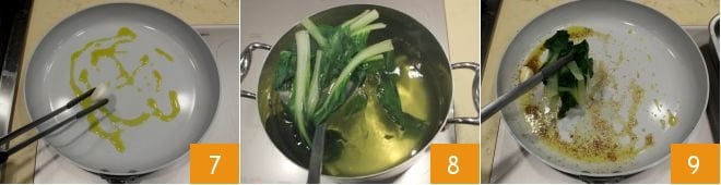 Dann bräunen Sie die ganze Knoblauchzehe in einer antihaftbeschichteten Pfanne an 7, lassen Sie den Mangold abtropfen 8, dann geben Sie ihn in die Pfanne, um ihn ca. 6 Minuten zu braten 9.