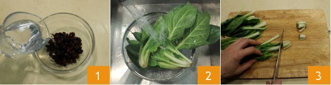 Um die Blätterteigtaschen gefüllt mit Mangold, Pinienkernen und Rosinen zuzubereiten, beginnen Sie damit, die Rosinen in einer kleinen Schüssel mit Wasser einzuweichen 1; dann waschen Sie den Mangold unter fließendem Wasser 2, schneiden Sie ihn ab, um den Strunk zu entfernen 3