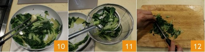 Entfernen Sie den Knoblauch 10, schalten Sie die Hitze aus und lassen Sie den Mangold abtropfen 11; lassen Sie ihn abkühlen und hacken Sie ihn fein 12.