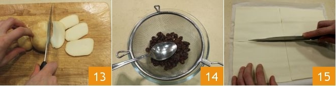 Schneiden Sie den geräucherten Scamorza in Scheiben 13 und lassen Sie die Rosinen aus dem Einweichwasser abtropfen 14. Rollen Sie beide fertigen Blätterteigrollen aus und teilen Sie sie mit einem scharfen Messer in 4 gleiche Teile 15.