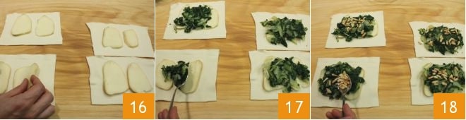 Legen Sie auf 4 Rechtecke jeweils 2 Scheiben geräucherten Scamorza 16, dann den gebratenen Mangold 17, gefolgt von den gerösteten Pinienkernen 18 und den abgetropften Rosinen: lassen Sie ein paar Zentimeter Rand vom Blätterteig.