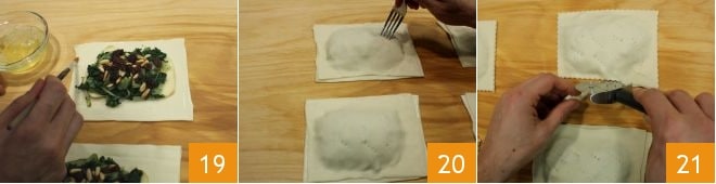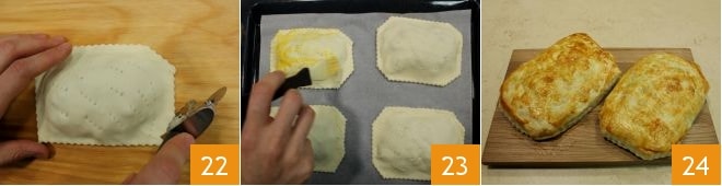 Trennen Sie das Eiweiß vom Eigelb des Eies, das zum Bestreichen benötigt wird, und bestreichen Sie den Teil des Blätterteigs ohne Füllung mit dem Eiweiß 19; legen Sie dann auf die 4 gefüllten Rechtecke weitere 4 Blätterteigrechtecke, um die Taschen zu verschließen, und stechen Sie die Oberfläche leicht ein 20. Veredeln Sie dann die Ränder mit einem gezackten Teigrädchen 21