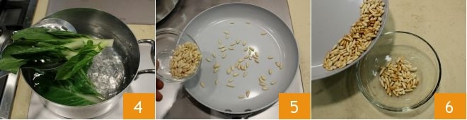 Kochen Sie ihn 5 Minuten in gesalzenem Wasser. In der Zwischenzeit rösten Sie in einer separaten Pfanne die Pinienkerne bei mittlerer Hitze in einer antihaftbeschichteten Pfanne 5, gelegentlich umrühren, um ein Anbrennen zu verhindern. Wenn sie leicht goldbraun sind, geben Sie sie in eine kleine Schüssel und stellen Sie sie beiseite 6.