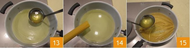 Einen Teil der Brühe 13 in einen Topf gießen und erhitzen. Die Spaghetti hinzufügen 14 und sie unter Zugabe einer weiteren Kelle Brühe 15 bei Bedarf garen.