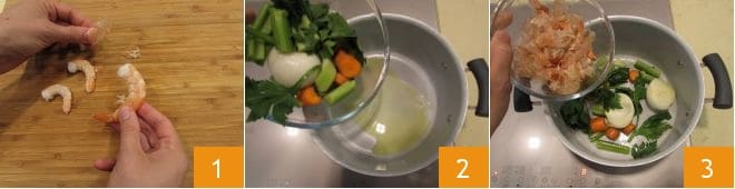 Um die Spaghetti mit Garnelen, Zucchini und Sojasprossen zuzubereiten, beginnt ihr mit der Herstellung der Bisque. Zuerst schält ihr die Garnelen 1, legt das Fleisch in den Kühlschrank und behaltet die Schalen. In einem Topf das Öl erhitzen und die grob geschnittene Zwiebel, den Sellerie und die Karotte hinzufügen 2. Lasst es anbraten, dann gebt auch die Schalen in den Topf 3.