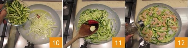 Das Öl in einem Topf erhitzen, den Knoblauch und die Chilischote (ihr könnt sie im Ganzen lassen oder halbieren, um die Samen zu entfernen) hinzufügen und anbraten lassen. Dann sowohl den Lauch als auch die Zucchini hinzufügen 10 und für ein paar Minuten anbraten. Knoblauch und Chilischote entfernen und die Garnelen hinzufügen. Für etwa 1 Minute anbraten, salzen, pfeffern 12 und die Hitze ausschalten.
