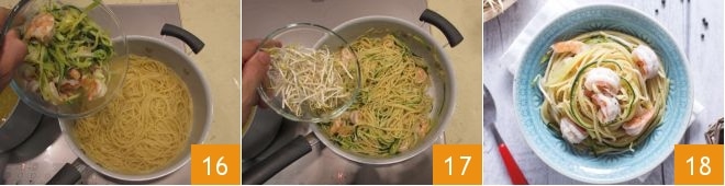 Sobald die Spaghetti gar sind, fügt die Garnelen und die Zucchini hinzu 16, schaltet die Hitze aus, fügt die Sojasprossen hinzu 17 und lasst alles für ein paar Minuten ziehen. Richtet eure Spaghetti mit Garnelen, Zucchini und Sojasprossen an 18 und serviert sie!