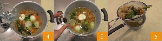 Wartet einige Minuten und gießt das Wasser hinein 4. Einige Pfefferkörner hinzufügen 5 und etwa 30 Minuten bei mittlerer Hitze kochen lassen. Dann alles abseihen 6 und die Brühe beiseite stellen.
