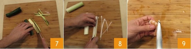Zucchini waschen und die Enden abschneiden, dann zuerst in Scheiben und danach in ziemlich dünne Streifen schneiden 7. Jetzt kümmert euch um den Lauch, entfernt den grünen Teil und schneidet ihn in derselben Größe wie die Zucchini 8. Nehmt die Garnelen und schneidet sie mit einem kleinen Messer am Rücken ein, um den Darm zu entfernen 9.