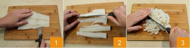 Um die Stockfischkrapfen zuzubereiten, beginnt mit der Reinigung des Stockfischs. Stellt sicher, dass euer Stockfisch bereits entsalzt wurde, andernfalls Wie man Kabeljau entsalzt. An diesem Punkt entfernt die Haut vom Filet, indem ihr ein sehr scharfes Messer verwendet und es parallel zum Fleisch führt 1. Schneidet das Fischstück zunächst in Streifen 2 und dann in Würfel und hackt es mit dem Messer 3.