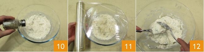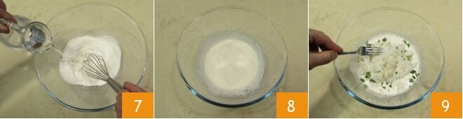 Gießt das eiskalte Wasser nach und nach hinzu und mischt es mit einem Schneebesen 7, bis ein glatter und homogener Teig entsteht 8. Dann fügt auch den Stockfisch hinzu und mischt alles 9.