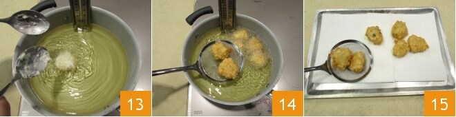 und lasst sie ins heiße Öl fallen 13. Frittiert so nur wenige Stücke gleichzeitig etwa 6-7 Minuten lang, wobei ihr die Krapfen oft wendet. Wenn sie gut goldbraun sind 14, lasst sie auf einem Tablett mit saugfähigem Papier abtropfen, um das überschüssige Öl aufzusaugen 15. Frittiert weiter, bis der Teig aufgebraucht ist, und serviert eure Stockfischkrapfen noch warm!