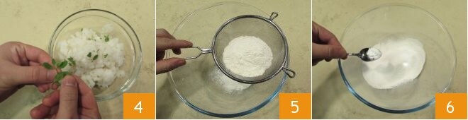 Sobald es grob zerkleinert ist, gebt es in eine kleine Schüssel und fügt die Majoranblätter hinzu 4. In einer anderen Schüssel siebt die beiden Mehle zusammen 5 und fügt das Backpulver hinzu 6.