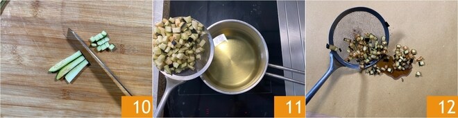 In der Zwischenzeit kümmern Sie sich um die Auberginen. Schneiden Sie sie in Würfel 10, frittieren Sie sie in Öl bei 160 Grad für drei Minuten 11 und wenn sie schön goldbraun sind, können Sie sie auf Küchenpapier abtropfen lassen 12.