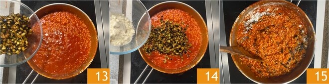Wenn der Reis fertig ist, fügen Sie die frittierten Auberginen hinzu 13, rühren Sie mit geriebenem Parmesan ein 14, und mischen Sie gut, um alle Zutaten zu integrieren 15.