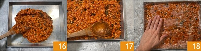 Den Reis in eine ausreichend große Backform geben 16, gut verteilen, um eine nicht zu dicke Schicht zu erhalten 17. Mit Frischhaltefolie abdecken 18, auf Raumtemperatur abkühlen lassen und dann mindestens zwei Stunden im Kühlschrank fest werden lassen.