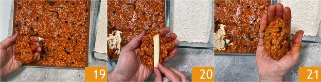 Nach dieser Zeit den abgekühlten Reis wieder aufnehmen, mit nassen Händen eine Portion Reis entnehmen und mit einer Scheibe geräuchertem Scamorza füllen 20. Nochmals mit feuchten Händen jeden Supplì gut verschließen, um zu verhindern, dass der Scamorza austritt 21.