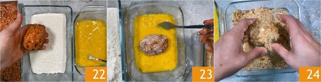 Kümmern Sie sich um das Panieren der Supplì: zuerst in Mehl wenden 22, dann in geschlagenen Eiern 23 und schließlich in Semmelbröseln 24.