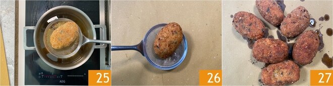 Das Öl auf 160 Grad erhitzen und die Supplì einzeln frittieren 25 für etwa drei Minuten. Wenn sie gut goldbraun und knusprig sind, auf Küchenpapier abtropfen lassen 26, so mit allen anderen Supplì fortfahren 27 und heiß servieren!