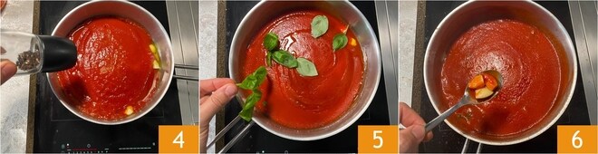 Duften Sie mit einer Prise schwarzem Pfeffer 4 und frischen Basilikumblättern 5. Nach etwa 20 Minuten bei schwacher Hitze entfernen Sie die Knoblauchzehen 6.