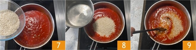 Nun können Sie den Reis zur Sauce geben 7, das kochende Wasser dazu gießen 8 und bei mittlerer bis niedriger Hitze 20 Minuten kochen lassen, dabei oft umrühren 9. So haftet der Reis nicht am Boden und nimmt die gesamte Flüssigkeit auf.