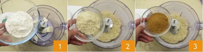 Um die Tarte mit Matcha-Tee-Creme zuzubereiten, beginnen Sie als erstes mit der Zubereitung des Mürbeteigs. Geben Sie die kalte Butter in kleinen Würfeln in die Schüssel eines Mixers mit Klingen, fügen Sie das Mehl Type 00 hinzu 1 und mixen Sie alles, bis eine krümelige Mischung entsteht. Fügen Sie dann das Mandelmehl 2, den Vollrohrzucker 3 hinzu und mixen Sie erneut alles, bis eine homogene Mischung entsteht.