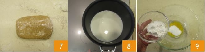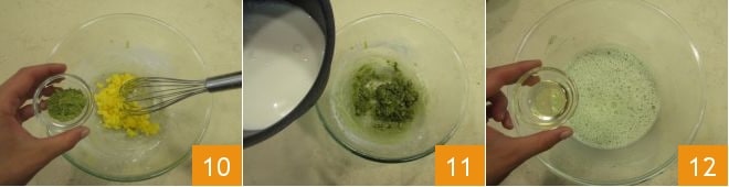 Formen Sie einen Teigballen und wickeln Sie ihn in Frischhaltefolie 7 und lassen Sie ihn mindestens 40 Minuten im Kühlschrank ruhen. In der Zwischenzeit bereiten Sie die Matcha-Tee-Creme vor. Gießen Sie die Milch in einen kleinen Topf 8 und erhitzen Sie sie, bis sie fast kocht. In der Zwischenzeit geben Sie die Eigelbe, den Zucker und die Maisstärke 9 in eine Schüssel; schlagen Sie schnell mit einem Schneebesen.