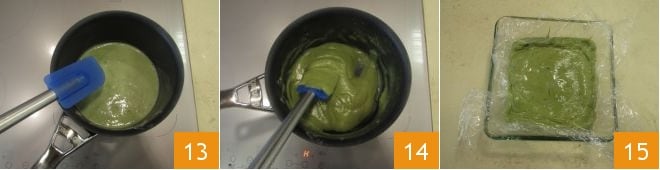und geben Sie die Mischung zurück in den kleinen Topf 13. Kochen Sie ein paar Minuten bei schwacher Hitze, dabei ständig umrühren, bis die Creme eindickt 14. Gießen Sie sie nun in eine Auflaufform, decken Sie sie mit Frischhaltefolie ab 15 und lassen Sie sie im Kühlschrank abkühlen.