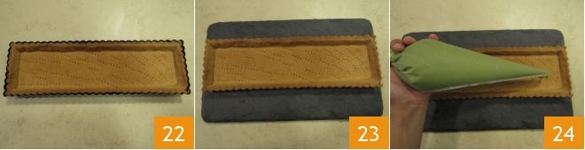 Backen Sie im vorgeheizten, statischen Ofen bei 170 °C für etwa 15 Minuten auf der mittleren Schiene, bis sie goldbraun ist 22. Lassen Sie sie dann vollständig abkühlen, bevor Sie sie aus der Form nehmen 23. Arbeiten Sie nun die Creme für ein paar Sekunden mit einer Spachtel, füllen Sie sie in einen Spritzbeutel und verwenden Sie sie, um die Tarte zu füllen 24.