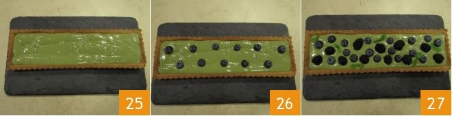 Glätten Sie dann die Oberfläche 25 und dekorieren Sie mit frischen Heidelbeeren 26, Brombeeren und ein paar Minzblättern. Ihre Matcha-Tee-Tarte ist bereit, serviert zu werden 27!