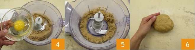 Fügen Sie nun das ganze Ei hinzu 4 und mixen Sie alles erneut 5. Übertragen Sie dann den Mürbeteig auf eine leicht bemehlte Fläche und bearbeiten Sie ihn für ein paar Sekunden 6.