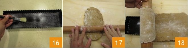 Nun eine rechteckige Form von 35,5x10,5 cm einfetten 16. Nehmen Sie den Mürbeteig und rollen ihn auf einer leicht bemehlten Fläche aus 17, um ein Rechteck mit einer Dicke von einem halben cm zu erhalten. Mit Hilfe des Nudelholzes legen Sie den Teig in die Form 18