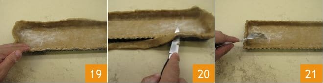 und drücken Sie den Mürbeteig mit den Fingerspitzen an die Form 19. Entfernen Sie den überschüssigen Teig mit einem kleinen Messer 20 und stechen Sie den Boden der Tarte mit einer Gabel ein 21.