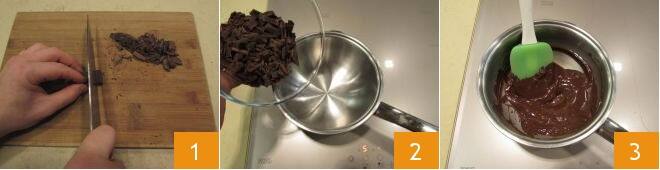 Um den Toten-Torrone zuzubereiten, hacken Sie 100 g dunkle Schokolade 1, um sie im Wasserbad zu schmelzen 2: Achten Sie darauf, dass das Wasser im Topf, den Sie erhitzen, den Boden der Schmelzschüssel nicht berührt, in der Sie die Schokolade schmelzen. Rühren Sie weiter, um die Schokolade gut zu schmelzen 3.