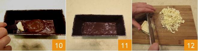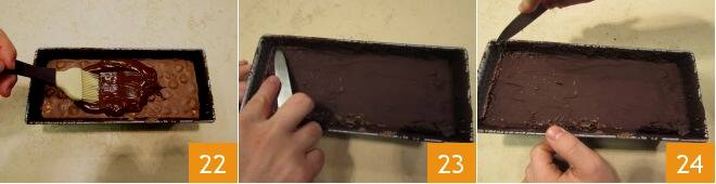 Stellen Sie die Form für mindestens 30 Minuten oder bis die Schokolade fest ist in den kältesten Teil des Kühlschranks 7. Nach der notwendigen Zeit schmelzen Sie weitere 100 g dunkle Schokolade im Wasserbad 8: Gießen Sie sie dann in die Form 9.