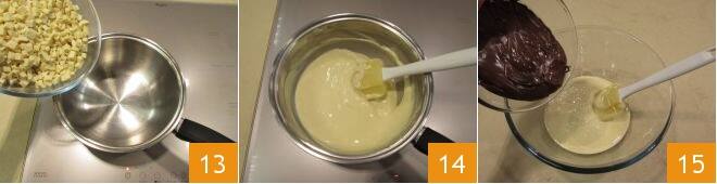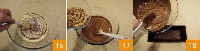 Mischen Sie die Zutaten, solange die weiße Schokolade noch warm ist 16, und fügen Sie zuletzt die geschälten ganzen Haselnüsse hinzu 17, wobei Sie die Zutaten gut vermischen. Zu diesem Zeitpunkt sollte die Schokolade in der Form fest sein: Nehmen Sie die Form aus dem Kühlschrank und gießen Sie die gerade hergestellte Mischung hinein 18.