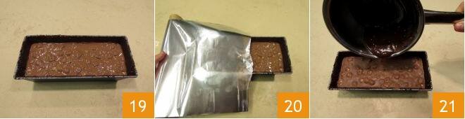 Verteilen Sie die Mischung in der Form 19 mit Hilfe eines Spatels. Platzieren Sie dann die Form für mindestens 4-5 Stunden wieder in den Kühlschrank und decken Sie sie mit einem Blatt Alufolie ab 20. Achten Sie darauf, dass die Alufolie nicht mit der Mischung in Berührung kommt, um ein Anhaften im Kühlschrank zu vermeiden. Nachdem der Torrone abgekühlt ist, stellen Sie sicher, dass die Oberfläche fest ist und schmelzen Sie die restlichen 100 g dunkle Schokolade im Wasserbad, gießen Sie sie über den Torrone 21.