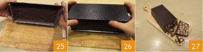 Bestreichen Sie die gesamte Oberfläche mit Schokolade 22 und kühlen Sie sie weitere 30 Minuten, um sie fest werden zu lassen. Nehmen Sie sie dann aus dem Kühlschrank und schneiden Sie mit einem kleinen Messer die Schokolade entlang des Randes der Form ein 23. Lassen Sie dann die Messerklinge zwischen den Torrone und die Formwände gleiten 24, um ihn zu lösen. Sie sollten ein leichtes Knacken hören, was darauf hinweist, dass sich der Torrone von der Form gelöst hat.