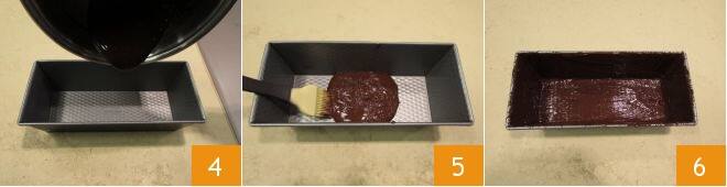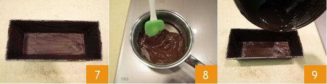 Gießen Sie dann die geschmolzene Schokolade in eine konische Kastenform mit einer Basisgröße von 22x8 cm, einer Oberfläche von 26x11 cm und einer Höhe von 7,5 cm 4: Verwenden Sie einen Küchenpinsel, um die geschmolzene Schokolade auf der gesamten Oberfläche der Form aufzutragen, um diese vollständig auszukleiden (5-6).