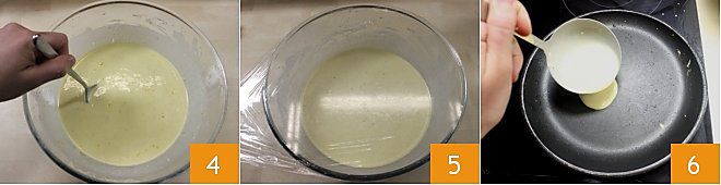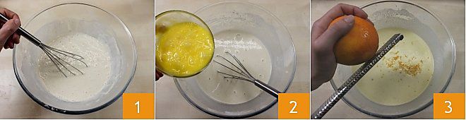 Um die süße Crêpe-Torte zuzubereiten, beginnen Sie mit der Zubereitung der Crêpes, die die Struktur Ihres Desserts bilden werden: Geben Sie in eine hohe Schüssel das zuvor gesiebte Mehl, den Kristallzucker, die Samen einer halben Vanilleschote oder ein Päckchen Vanillin, eine Prise Salz und die Milch. Arbeiten Sie die Mischung mit einem Schneebesen oder einem elektrischen Mixer, bis sie glatt, samtig und klumpenfrei ist 1. In einer separaten Schüssel schlagen Sie die Eier mit einer Gabel und fügen Sie sie dann zu den anderen Zutaten hinzu 2 und rühren Sie weiter. Schmelzen Sie die Butter in einem Topf bei niedriger Hitze und lassen Sie sie abkühlen, fügen Sie sie dann dem Crêpes-Teig hinzu und mischen Sie gründlich. Fügen Sie schließlich die geriebene Orangenschale zur Mischung hinzu 3.
