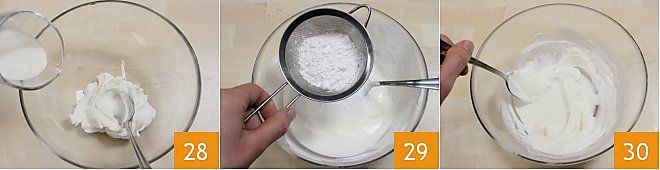 Wenn Sie die Schichten beendet haben, bereiten Sie die Creme für die Garnierung vor: Geben Sie in eine Schüssel 100 g griechischen Joghurt und verdünnen Sie ihn mit flüssiger Sahne 28; fügen Sie dann den gesiebten Puderzucker hinzu und mischen Sie mit einem Löffel, bis Sie eine flüssige Creme erhalten 30.
