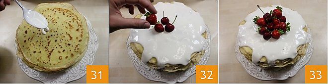 Lassen Sie die so erhaltene Creme mit einem Löffel nach und nach von der Mitte aus oben auf die Torte laufen 31. Jetzt können Sie die Torte dekorieren, indem Sie ganze Kirschen und Erdbeeren darauf legen 32 und einige Minzblätter hinzufügen, um Ihrer süßen Crêpe-Torte einen spektakulären Touch zu verleihen 33.
