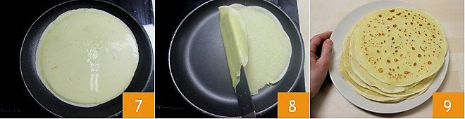 Verteilen Sie den Teig schnell und sorgfältig mit einer Kelle oder einem Löffel auf der gesamten Pfannenoberfläche 7. Lassen Sie ihn eine Minute kochen, heben Sie die Crêpe-Ränder von Zeit zu Zeit mit einem Crêpes-Spachtel oder einem Holzspatel an, um sie von der Oberfläche zu lösen; sobald sie goldbraun ist, drehen Sie sie auf die andere Seite und warten Sie, bis sie ebenfalls dieselbe Farbe annimmt 8. Sobald sie fertig ist, schieben Sie sie auf einen Teller und verfahren Sie auf dieselbe Weise mit den restlichen Crêpes, indem Sie sie nach und nach aufeinander stapeln, sobald sie fertig sind 9. Decken Sie sie mit Küchenpapier ab und stellen Sie sie beiseite.